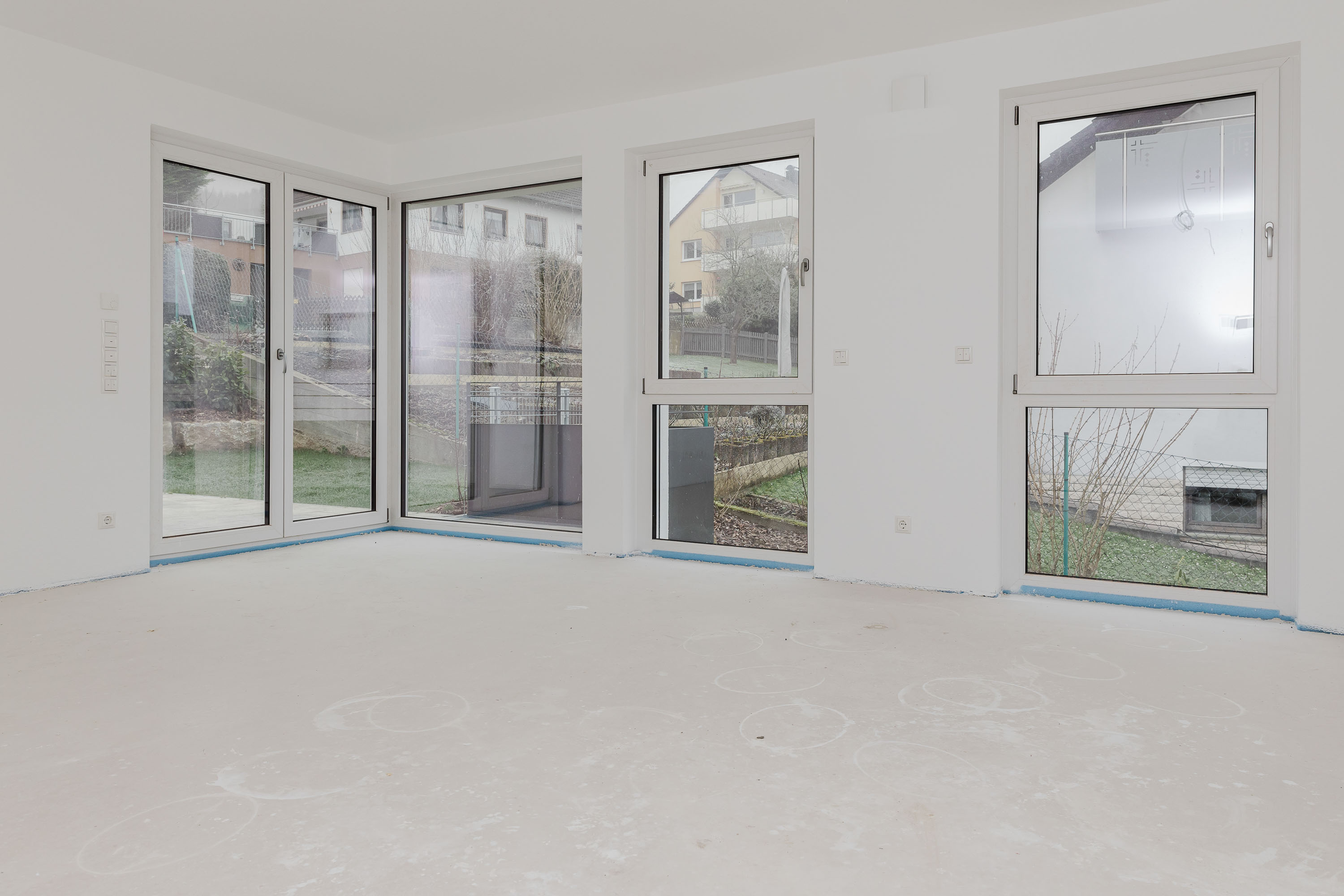der Grundstückgrenze und im Untergeschoss; alle Wohnungen