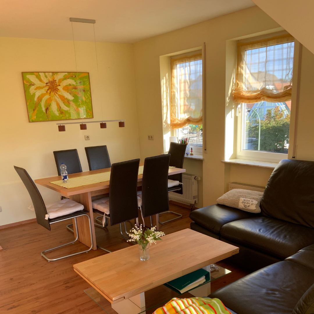 Die hellen offene Räume sorgen generell für ein tolles Wohngefühl. Das Wohn- Esszimmer bietet verschiedene Stellmöglichkeiten von Tisch- und Wohnlandschaft. Vom Wohnzimmer aus führen zwei große Fenstertüren zum Balkon. Dieser hat eine Süd-Ausrichtung. Eine nachträglich eingebaute elektrische Außen Jalousie sorgt in heißen Sommermonaten für entsprechende Kühle und Im Winter wird die Wärme dadurch Abends in den Räumen gehalten.