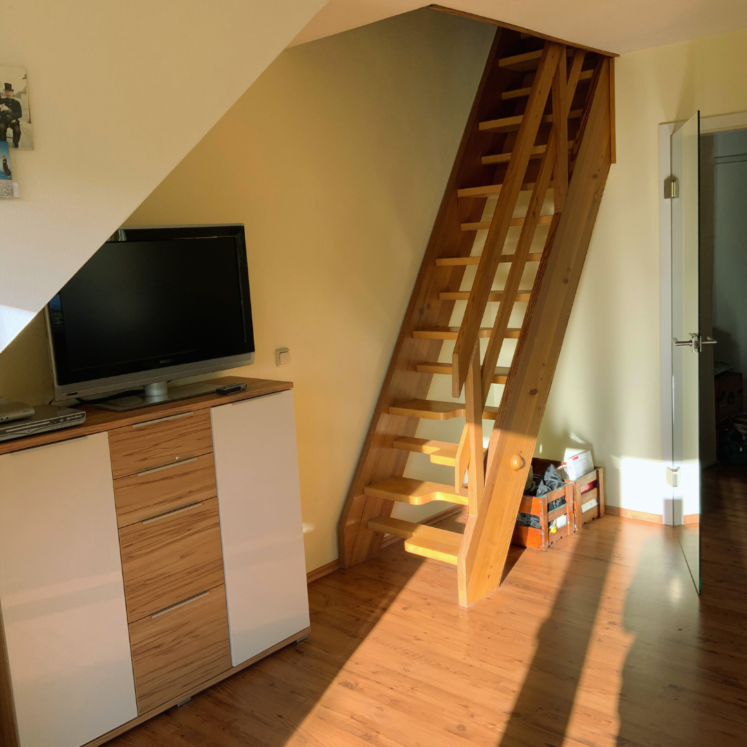 (Im Wohnzimmer besteht optional ebenfalls die Möglichkeit eine Küche anzuschließen) Eine Treppe führt vom Wohnzimmer ins Schlafzimmer im Spitzgiebel. Küche mit Einbauküche ist bereits vorhanden. Tageslichtbad mit Wanne und Dusche.